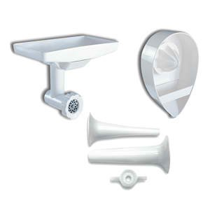 - Stand-mixer attachment pack includes food grinder, sausage nozzle, citrus juicer, and tray