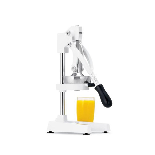 The Focus manual, lever action, Olympus Juicer features an enamel finish, cast iron, and rubberized handles and suction-cup feet. This model has an overall height of 31" and features 3-pinion design and an 18/10 stainless steel perforated strainer cone.