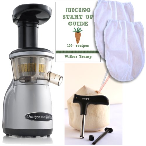 Omega VRT350 Juicer + 2 Nut Milks Bags + Juicing Book,Recipes + CocoDrill Coconut Tool Heavy Duty Dual-Stage Vertical Single Auger Low Speed Juicer