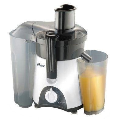 The Oster 24oz Juicer 400W (model: 3157) features a convenient one-movement safety locking arm for fast and safe operation, removable feed chute for easy cleaning and storage, sturdy all stainless steel filter for durability, and powerful 400 Watt motor for tough tasks. Large capacity jar conveniently holds up to 20oz of juice. Dishwasher safe parts are easy to disassemble and allow for easy cleaning. Large capacity pulp collector container and juice jug included.