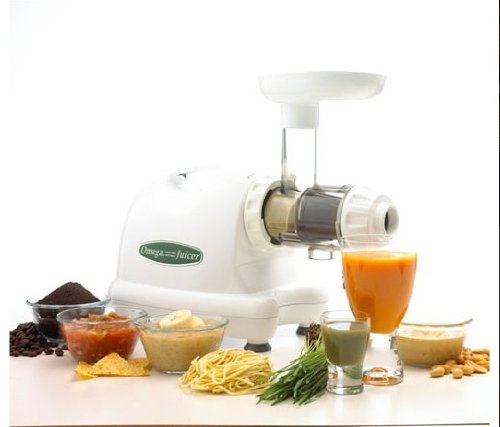 The Omega Juicer Model 8003 Nutrition Center is Omegas new single gear, masticating juicer that will serve all of your juicing needs and much more. This unit is a multiple use appliance that actually does all of its uses very well. Most appliances that are built for more than one use tend to compromise one task or another. But the Omega Juicer 8003/8005 excels at all of its functions, especially as a wheatgrass juicer. Finish: White. Single-Phase induction auger RPM: 75-85 RPM Rotation speed. Continuous juicing with automatic pulp ejection. UL and cUL approved. High juice yield very dry pulp. Single gear produces less foam than double gears. Two juicing screens for firm and soft produce. No heat build up. Heavy duty construction using the highest quality materials. Engineered for quiet operation and long life. Built in reverse prevents clogging. Easy to assemble, operate and clean. No separate attachments needed. Very quiet 1/3 HP motor. Gear runs at 2 HP with Gear Reduction. Dimensions: 7-3/8 L x 15 W x 11.25 H. Voltage: 120V/60Hz. 10 Year warranty.