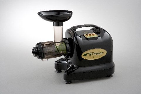 The Samson GB-9002 Black (formerly the 9001 Black) Six-in-one Single-Gear Juicer is a multi-functional juicer that extracts juice from fruits, vegetables, wheat grass, and other leafy greens. This appliance makes pasta and noodles, grinds herbs and seasonings, makes baby food, minces meats, grinds coffee, and makes desserts from frozen fruit. Its unique low-speed (80 RPM) and mill-type single gear preserves nutrient value. Video Demonstration, Click Here! SIX MACHINES IN ONE Vegetable Juice Extractor The Samson GB-9002 Six-in-one Juicer can extract healthy juices from celery, parsley, spinach, wheatgrass, apple, orange, kale, cucumber, ginger, sprouts, and many other leafy greens. It can also extract juices from aloe and pine leaves which no other existing juicers on the market have ever done before. Fruit Juicer The low-speed screw prevents natural flavors and high nutritional contents from being destroyed. Seasoning Mincer/Chopper The Samson GB-9002 Six-in-one Juicer chops and minces seasonings such as garlic, scallion, onion, red pepper, ginger, radish, and many others without destroying their natural flavor and nutrition. Meat/Fish Mincer The Samson GB-9002 Six-in-one Juicer can mince all kinds of meat and fish together with chopped seasonings such as garlic, pepper, and onion to easily prepare for a delicious meal. Food Mill The Samson GB-9002 Six-in-one Juicer can be used to make bread sticks, cookies, and pasta from steamed rice. And noodles too! WHY THE SAMSON GB-9002 SIX-IN-ONE JUICE EXTRACTOR? Compare our patented Six-in-one Juicer with other juice extractors on the market: The Samson GB-9002 Six-in-one Juicer is made of FDA approved polycarbonate and melamine which are semi-permanent and extremely hygienic. The Samson GB-9002 Six-in-one Juicer is equipped with a low-speed mill-type screw which preserves as much flavor and nutritional value as possible. (Other high-speed juicers can destroy natural flavor and nutritional value of vegetables and fruits) 2.