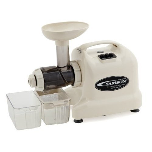 The GB-9003 juicer is basically the same machine as the classic Samson 6 in 1 juicer (GB-9001) with a few upgrades like a better juicer auger and juicer screen. It also has an upgraded look and includes some extras like nozzles, instructional DVD and juice cups. Finish: Ivory. The Samson 6-2 has the same single auger design used on Commercial Wheatgrass Juicers. Consequently, it is highly effective in extracting juice from wheatgrass and other leafy greens. At the same time the multi-functional Samson can extract healthy juices from carrots, apples, ginger, pine needles, aloe, beets, mugwort, yam, arrowroots, herbs, parsley, asparagus, cabbage, sprouts, cucumber, and many other fruits and vegetables. Higher yield, with drier pulp. The low-speed screw prevents natural flavors and high nutritional contents from being destroyed. Optionally available accessories. Made of U. S. FDA-approved polycarbonate and melamine, These materials are semi-permanent and extremely hygienic. High Power Magic is low speed stone mill-type screw which preserves as much flavor and nutritional value as possible. Very quiet 1/3 HP motor. Seasoning Mincer/Chopper. SAMSON chops and minces seasonings such as garlic, scallion, onion, red pepper, ginger, radish, and many others without destroying their natural flavor and nutrition. Nut/Seed Butters. SAMSON can make all kinds of nut and seed butters. Except Almond butter. Easy to clean. Built-in device which prevents it from overheating. The following items are included. Samson Multi-Purpose Juicer Motor, Augur, Drum, Drum Cap, Juicing Screen, Mincing Cone, Cups for catching juice or pulp (2), Sieve (1), Cleaning Brush, Pusher / Tamper, Juicing Nozzle, Mincing Nozzle, Noodle Nozzles (2), Pasta Nozzles (2), Color Cook Book and Operations Operation Manual, Operations DVD, and E