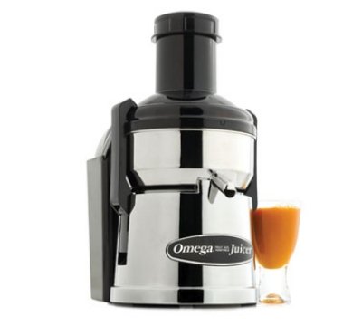 Omega Mega Mouth Pulp Ejection Juicer, extra large feed chute to accommodate whole fruits and vegetables, continuous juicing, surgical stainless steel bowl, cast aluminum housing, chrome finish, 1/2 HP motor, 375 watts, 11,000 RPM, CE, ETL, UL