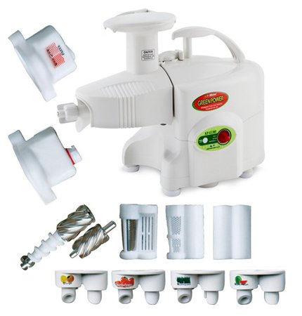 The Green Power KPE 1304 Twin Gear Juicer provides a great way to improve your diet and nutrition, by allowing you to make your own fresh juice, right at home. With patented twin gear and new bio-ceramic and magnetic technology, it naturally prolongs the storage time and freshness by ionizing your juice. Rather than juicing two, sometimes three times per day like other conventional juicers, you can prepare your juice once in the morning and store it for up to 72 hours! The Green Powers unique horizontal twin gears are so versatile allowing you to juice leafy greens and herbs, fibrous plants and grasses, and tough, stringy vegetables and even sprouts. Fruits and vegetables are thoroughly crushed, rather than cut or shred into small pieces, as other juicers do. Other older twin gear juicers are notorious for frequently clogging when juicing fruit like strawberries, kiwis, or watermelon. With the Green Power Juicer, you don't have to worry. It will juice continuously, without clogging. With a large feeding shoot and superior cutting gears, it's the right choice for those who want less preparation and easy feeding. Using the multi-purpose kit, a variety of pastas can be made. Multi-purpose functions also include grinding coffee, grains, seeds and nuts. The Green Power Juicer is designed for life. If an unusually hard substance accidentally enters the gears, the reverse rotation override immediately stops the motor before any damage occurs. Additionally, Green Power's precision balanced ¼ horsepower 160RPM motor generates very little noise or vibration compared to other juicers. We are confident that your Green Power Juicer will bring you a lifetime of trouble free, noise free, enjoyable juicing.