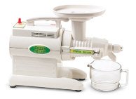 Green Star machines are reputably one of the world's best juice extractors and most efficient food processors. Using Exclusive Heavy Duty Twin Gear technology with a low 110 rpm, superior to those of any competitor, Green Star machines are your best choice. There is no need to look elsewhere. With their ease of use and simple clean up, Green Star Juice Extractors and Food Processors are award-winning machines of unsurpassed quality. This juicer is a complete kitchen machine in its ability to juice vegetables, fruits and grasses, as well as homogenizing, making nut butters and frozen fruit sorbet, and has the mochi cake attachment. This machine is quiet in operation and is unique in its magnetic and bio-ceramic technology, naturally prolonging the time of storage in the refrigerator to 48 hours with minimal oxidation. It has twin gears and operates at a low speed of 110 rpms. The motor is 190 watts (1/4 hp) and it weighs in at 30 pounds. Warranty for parts and motor is 5 years. Includes fine/coarse screen, homogenizing blank, juice pitcher, cleaning brush, plastic plunger and strainer.