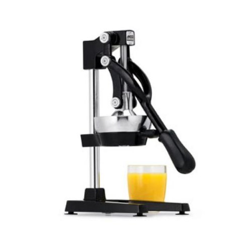 Juicer, manual, lever action, rubberized handles and suction-cup feet, 3-pinion design, NSF. Color: Black. 18/10 Stainless steel perforated strainer cone. Overall height: 27-1/2.