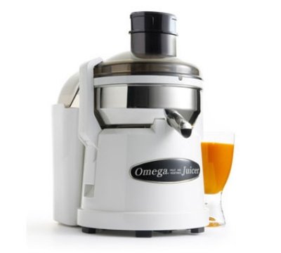 Omega Compact Pulp Ejection Juicer, continuous juicing, surgical stainless steel bowl, heavy duty blade, white, 1/3 HP induction motor, 250 watts, 6,200 RPM, UL