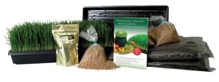 Contains 5 1 lb. bags of wheat, 5 trays, 2 5 lb. bags soil, 1 azomite, Book : Wheatgrass, Sprouts, Microgreens and the Living Food Diet" by Living Whole Foods, Inc., Instructions