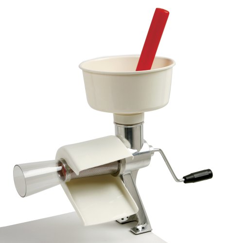 Automatically separates juice and pulp from seeds and skin, with an easy continuous operation. Ideal for home canning, freezing, and dehydrating. Perfect for tomato juice, fruit butters, fruit leather, applesauce, baby food, pumpkin pie filling, jams and jellies. No pre-cooking needed for soft textured fruits like tomatoes. Includes plunger, spout, standard spiral and stainless steel screen, recipes and instructions. Boxed