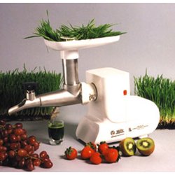 Now the most efficient home electric wheat grass juicer is available with all stainless steel juicing parts! Its newly designed auger and juice chamber provide maximum juice output of wheat grass in once pass without foaming. With a durable 200 watt motor it's great for juicing wheat grass, berries, and soft fruit. Easy to use, easy to clean. Maximum yield. * Designed For Household Use Only * Juice only comes in contact with Stainless Steel Components (feed chute, screen and auger) * Components that juice does not come in contact with (motor base and feeding funnel) are made of white plastic - * Feed Chute 1.5 inches round * 200 watt motor